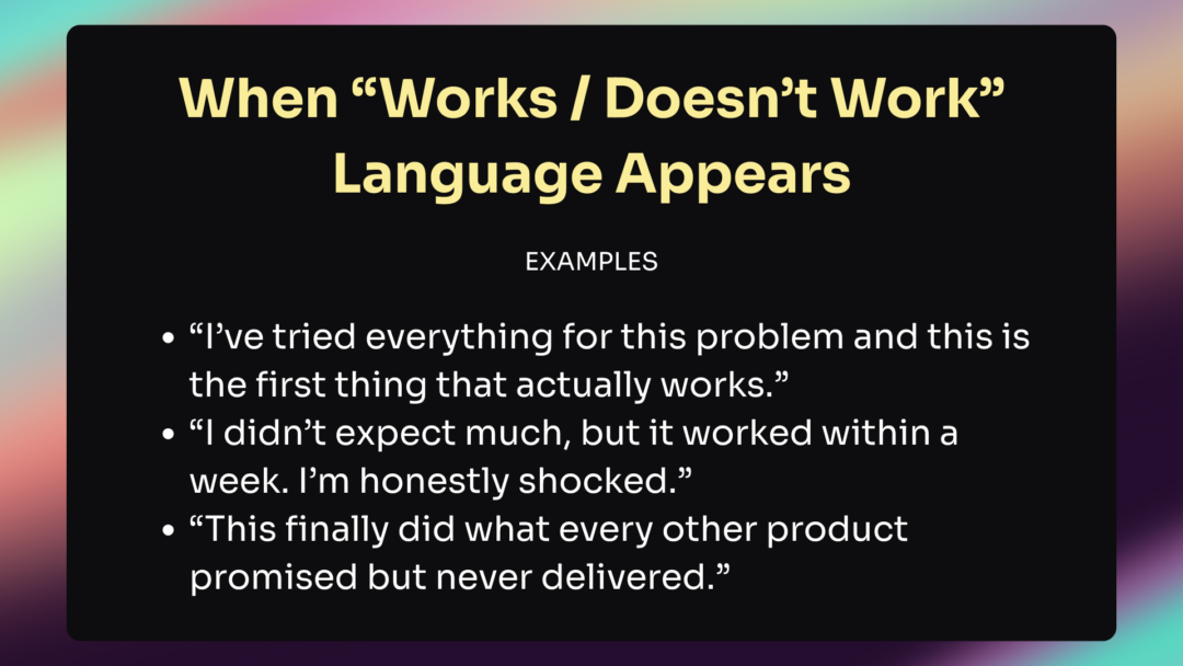 The reason this works is simple: marketing language sounds like marketing. Customer language sounds like a friend telling you about something that changed their life. When someone searching for a solution sees another customer saying “this finally worked,” it hits different than any claim you could make.