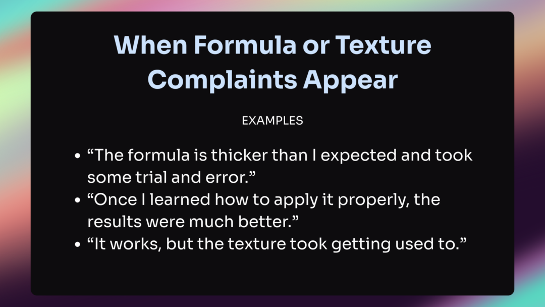 Simultaneously, escalate to product development. Pull every review mentioning “too thick,” “too thin,” “hard to apply,” “messy,” or “patchy” and send them to your product team with a clear directive: these SKUs need reformulation urgently.