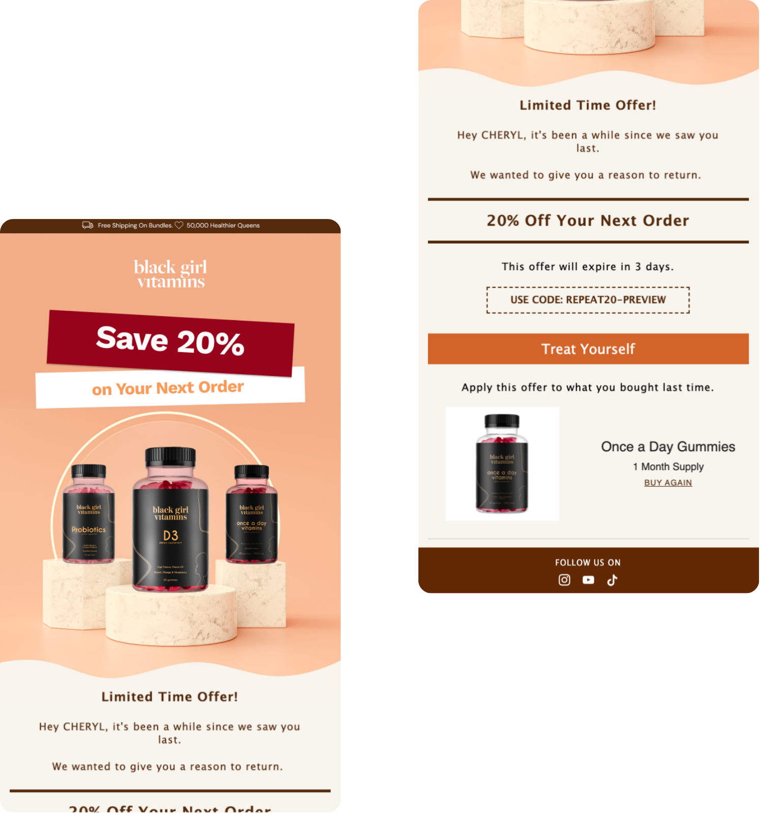 To do it, Ugwu and team leveraged Repeat’s triggers for Replenishment and Lapsed Customer Moments, personalizing the timing of each email to the customer, based on their past purchase history. They also streamlined flows for these Moments by using Repeat’s dynamic content blocks, which allows Black Girl Vitamins to show their customers products they’re due to replenish or products they previously purchased. All with little work from the Black Girl Vitamins team.