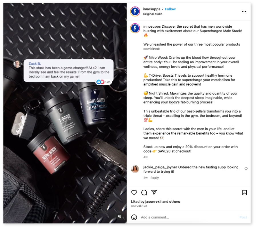 Inno Supps distinguishes itself in the market through three key competitive advantages: product quality, marketing strategy and leveraging social proof.
