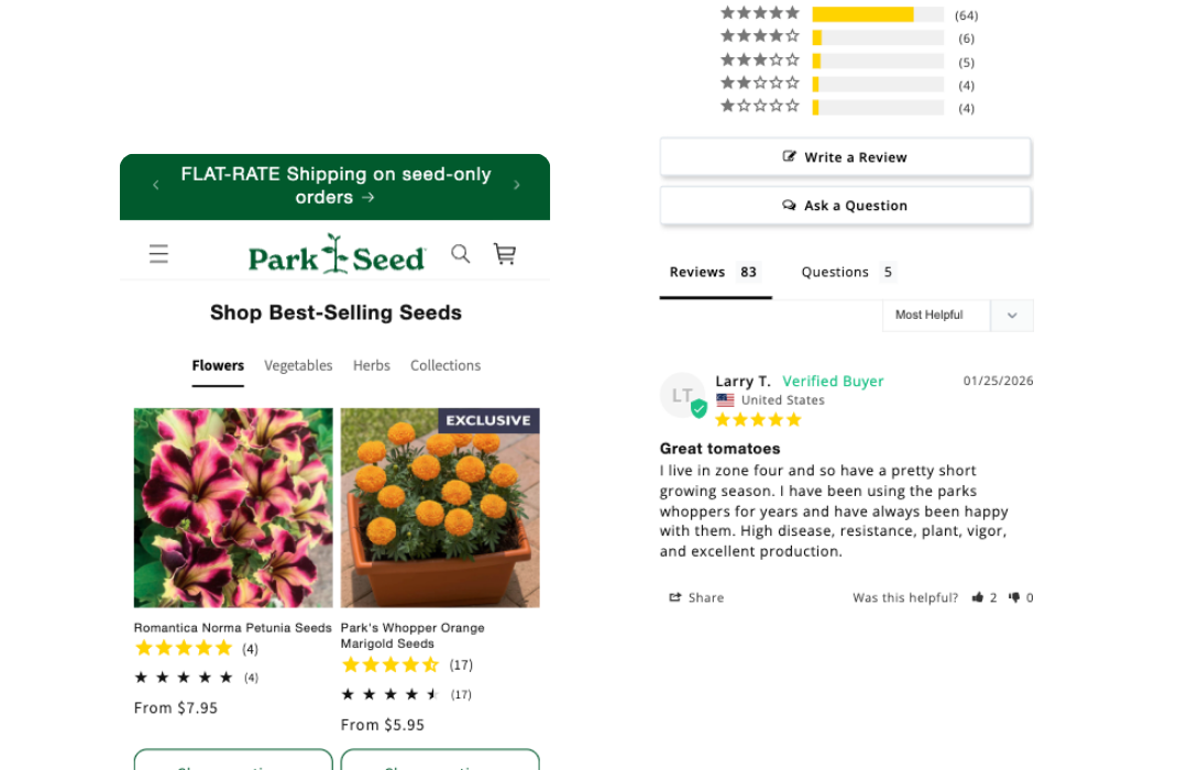 Park Seed was introduced to Stamped by Sovi Creative, a Shopify Plus agency that specializes in design, development, and marketing. From there, Park Seed implemented a scalable, automated reviews strategy that supported their move from Magento to Shopify.